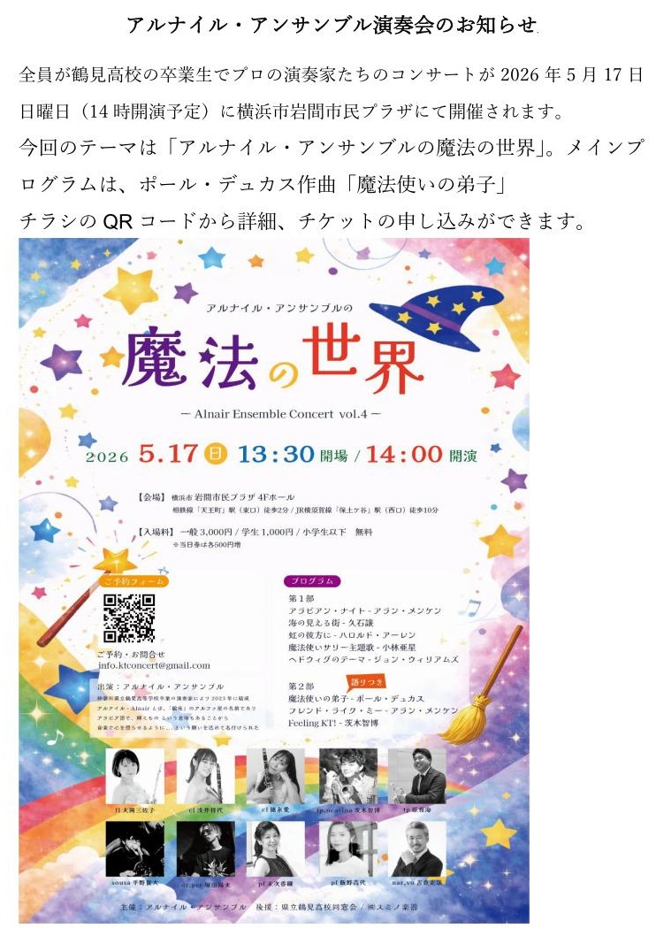 | 卒業生アンサンブル コンサートのお知らせ(2023/04/10) |